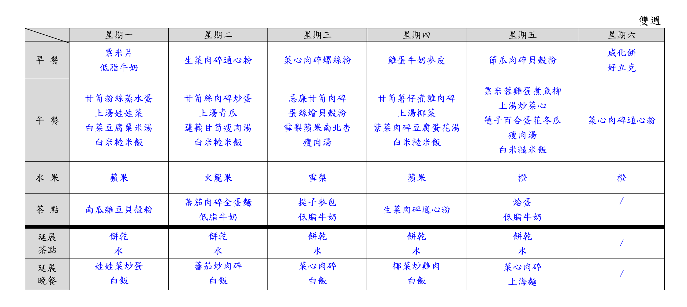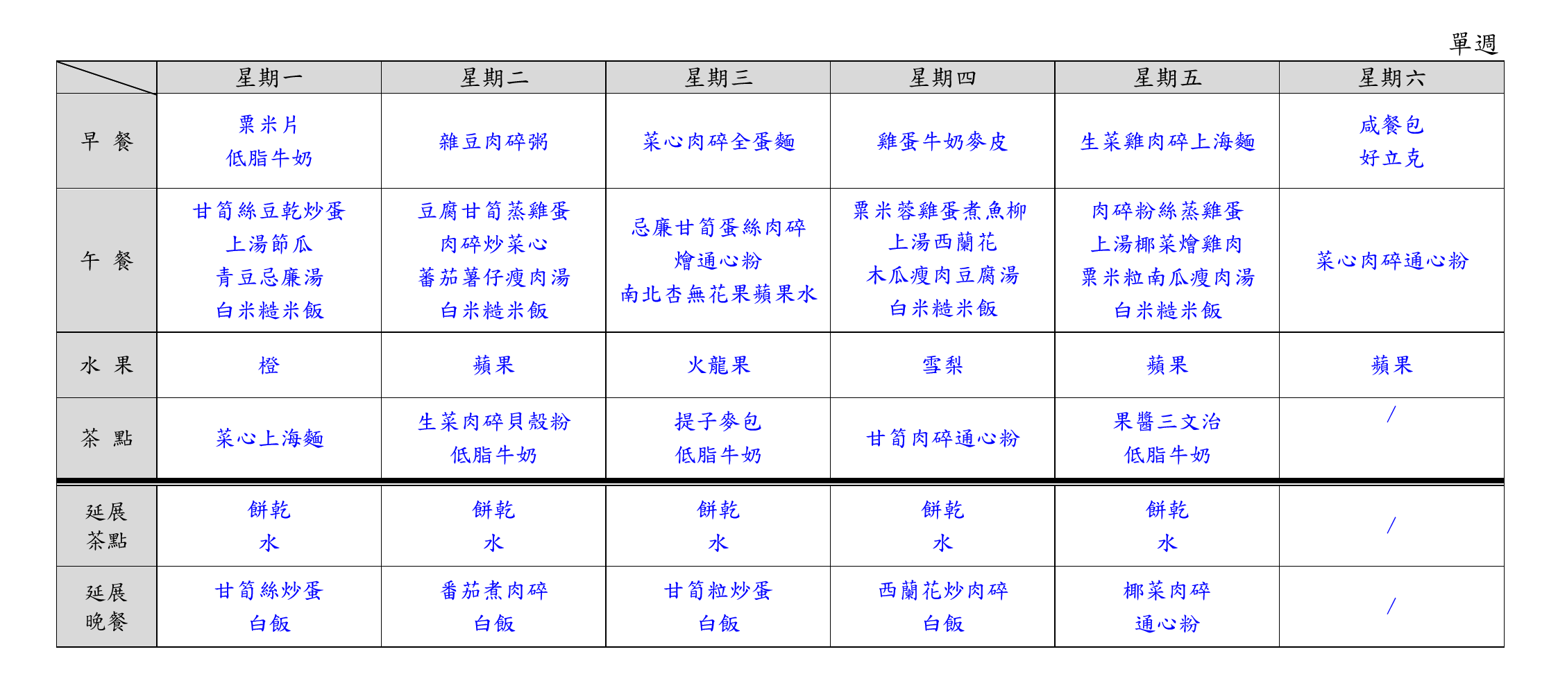 為了讓幼兒能有強健的體魄,本校持續按「幼營喜動校園營養指引」來編排健康餐單。至於烹調模式、份量等則參考香港「健康飲食金字塔」而訂定,把均衡飲食的好習慣與文化由學校推廣至家庭,牽動幼兒活出健康生活文化。