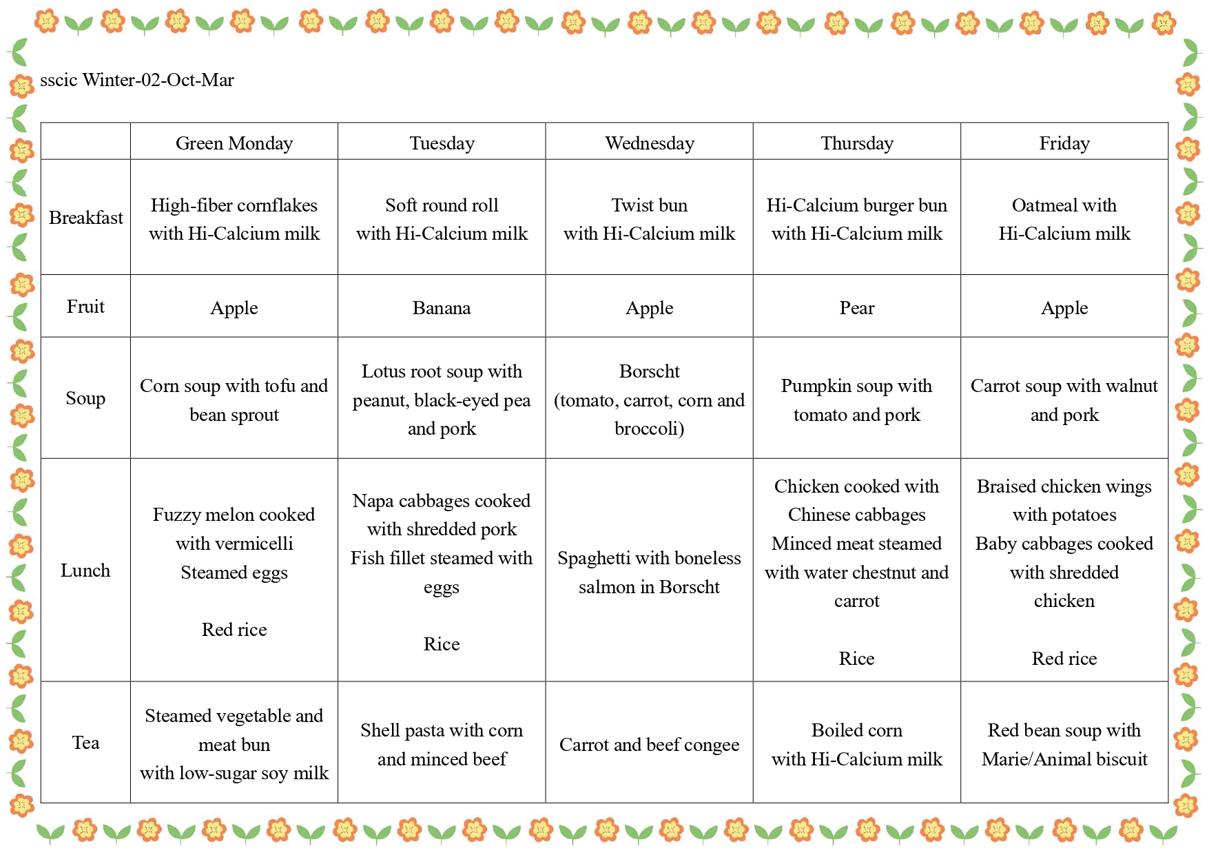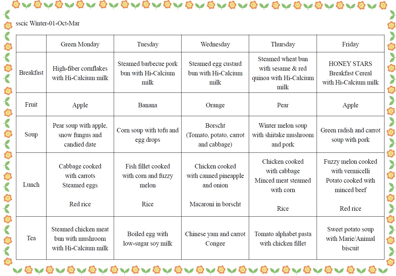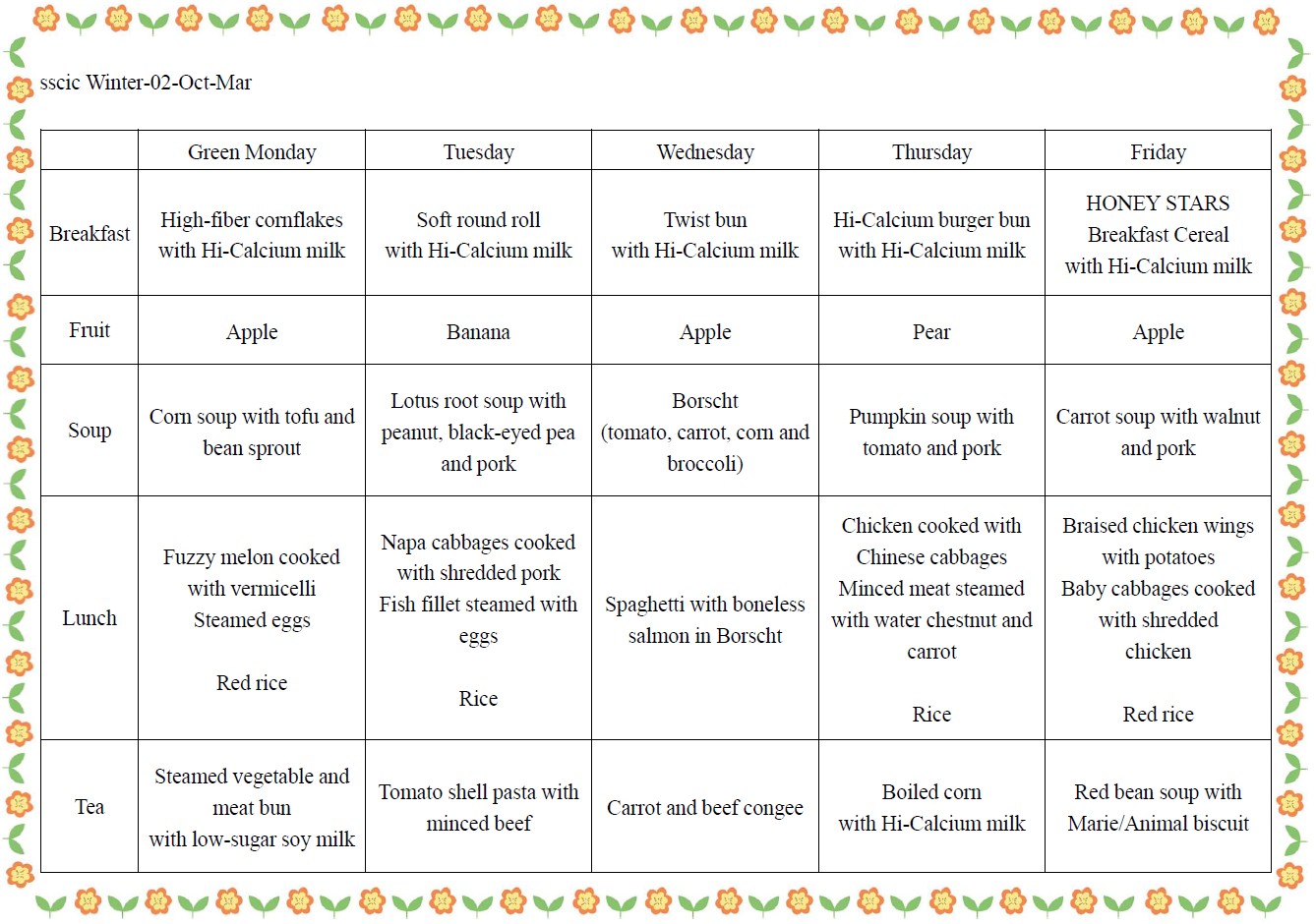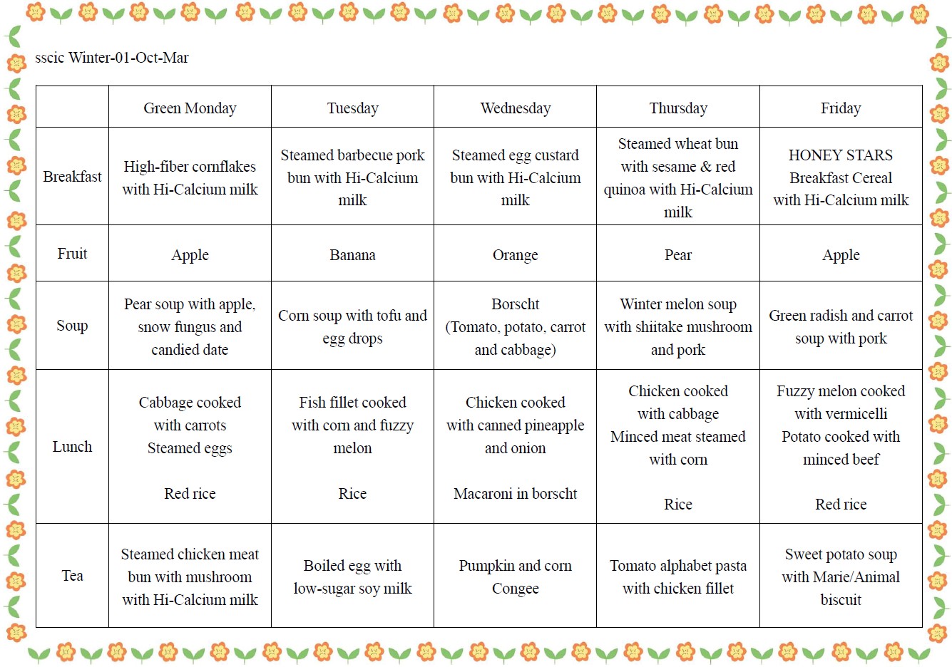 The school meal menu is compiled in accordance with the guidelines of the Social Welfare Department, different styles and balanced nutrition are provided at breakfast, lunch and afternoon tea to cultivate children's healthy and good eating habits.
