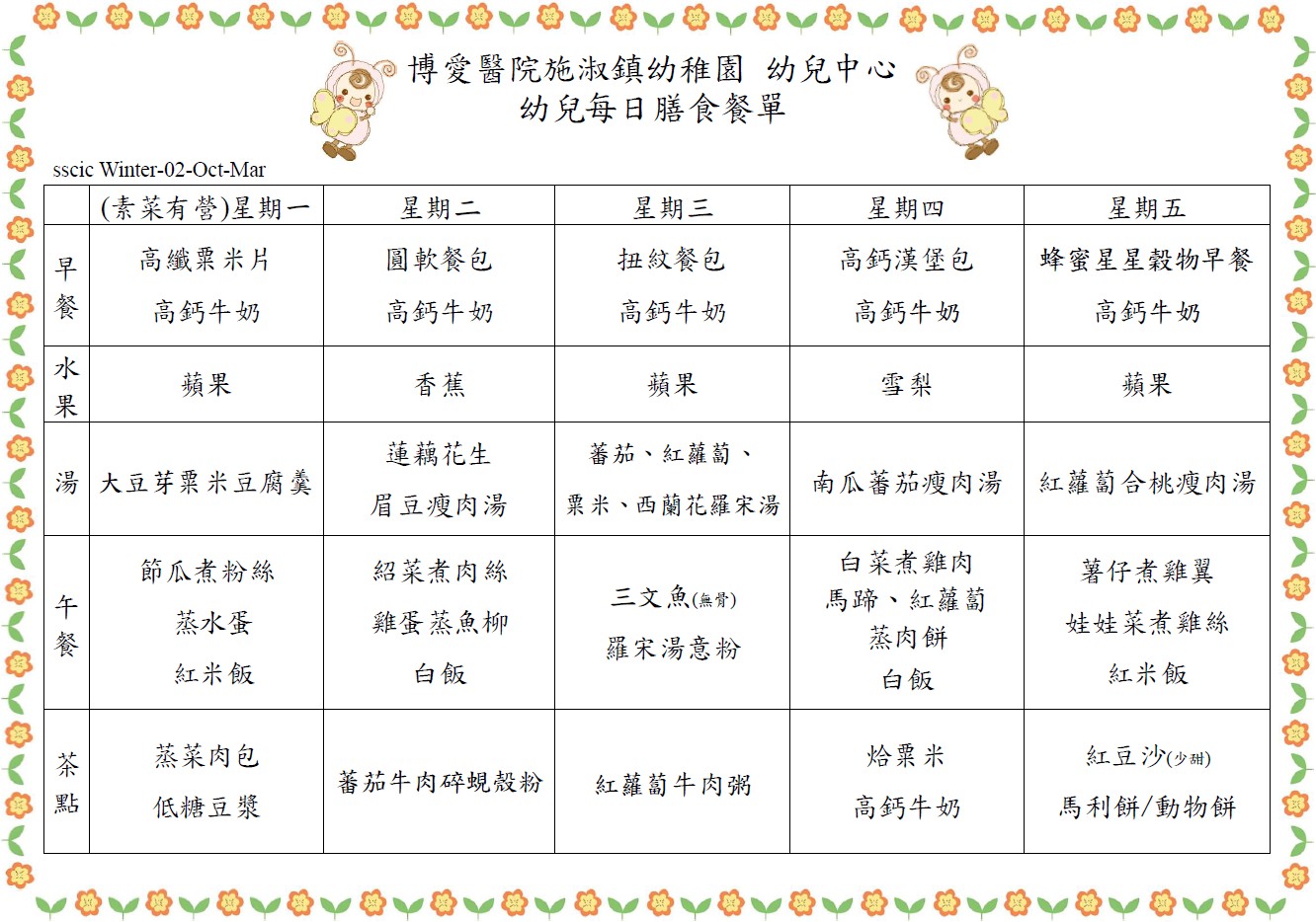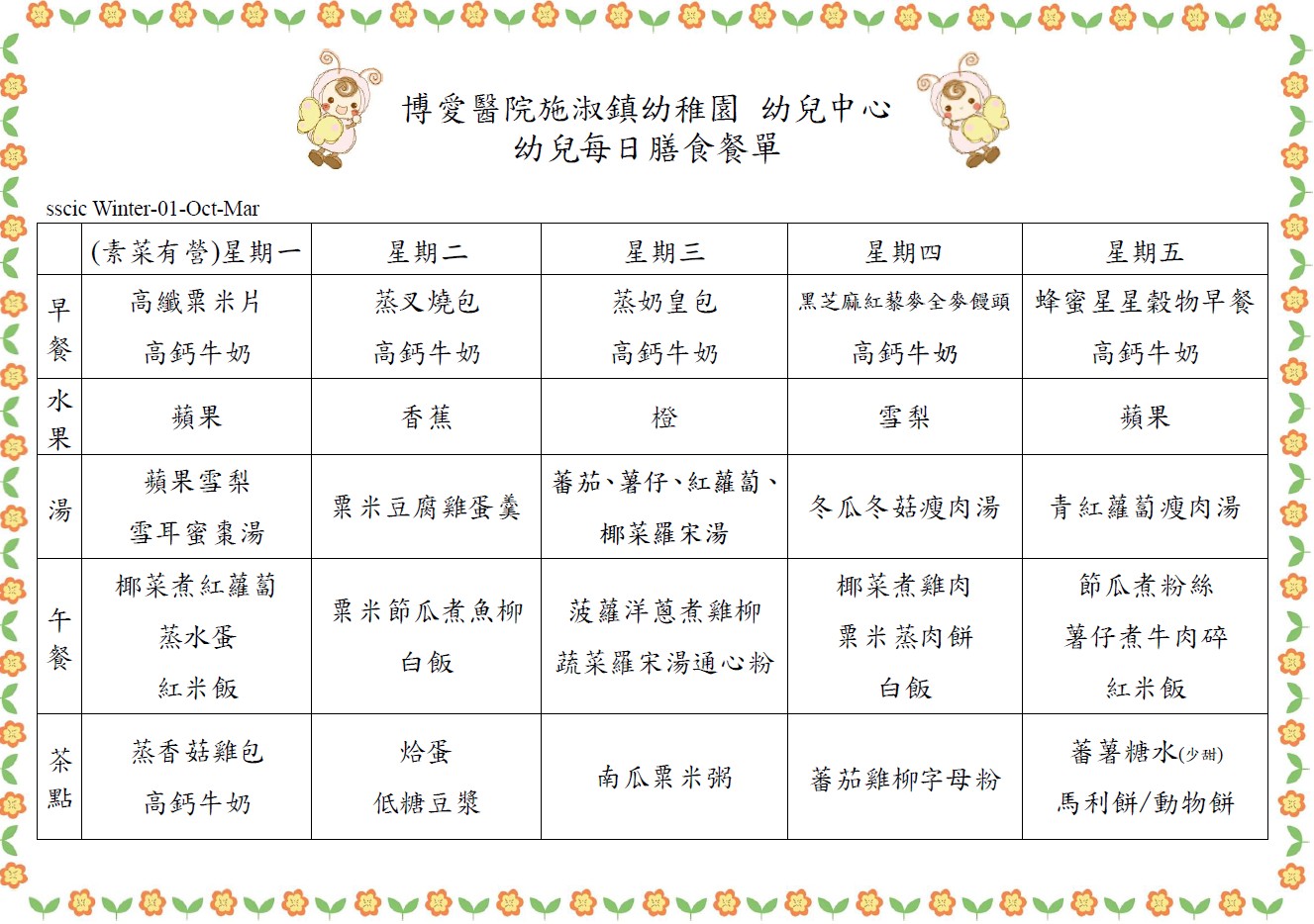 學校膳食餐單是參照社會福利署指引編訂,每日提供不同款式、營養均衡的早餐、午餐、水果及下午茶點,培養幼兒健康良好之飲食習慣。